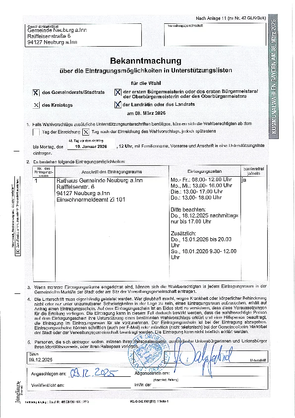 Bekanntmachung über die Eintragungsmöglichkeiten in Unterstützungslisten