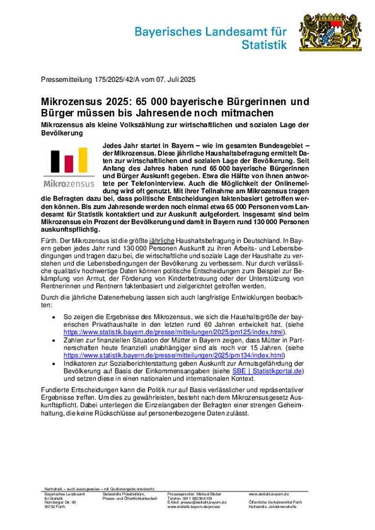 In Bayern – wie im gesamten Bundesgebiet – wird seit Januar dieses Jahres der Mikrozensus 2025 durchgeführt. Darüber hatten wir Sie bereits Anfang des Jahres mit unserer Pressemitteilung zum Start des Mikrozensus 2025 informiert. Der Mikrozensus ist die größte jährlich stattfindende Haushaltsbefragung der amtlichen Statistik in Deutschland. Die erhobenen Daten bilden die Basis für wichtige politische Entscheidungen, die alle Bürgerinnen und Bürger des Landes betreffen.