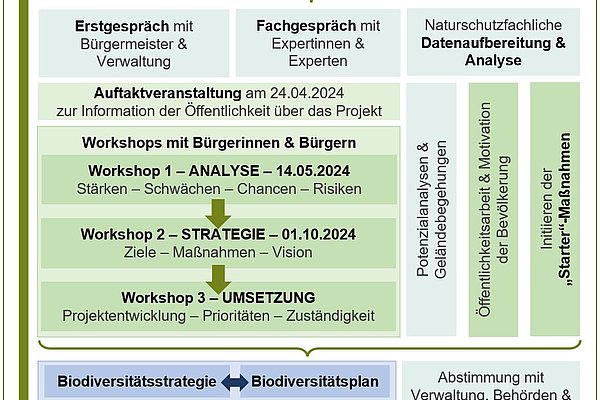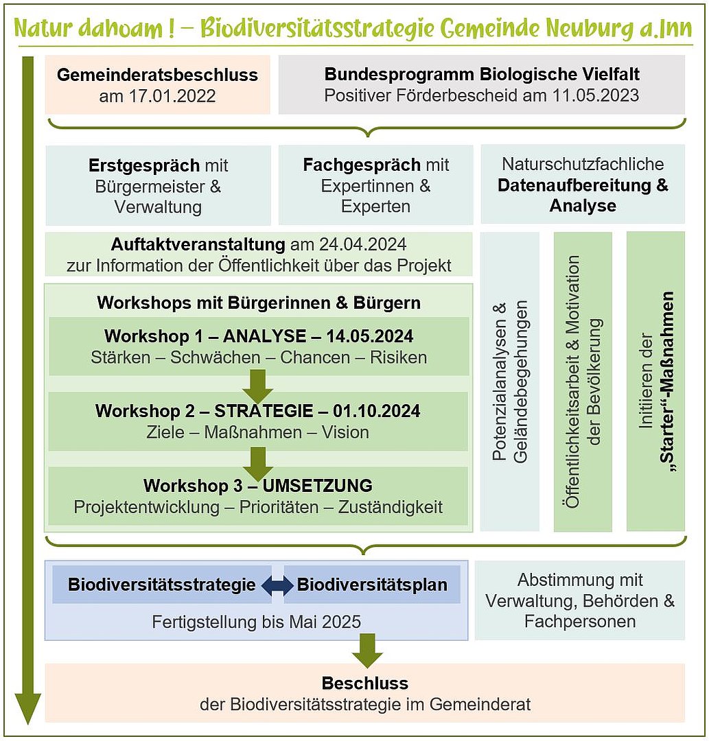 Besonders relevant ist dabei die Zusammenarbeit mit Fachbehörden, örtlichen Vereinen und Verbänden mit Natur- und Umweltbezug wie auch die Aktivierung der Bürgerinnen und Bürger der Gemeinde Neuburg a.Inn. Denn der Erhalt unserer „Natur dahoam“ betrifft uns alle. Jeder Beitrag zählt und nur gemeinsam gelingt es, die biologische Vielfalt unserer Heimat langfristig zu bewahren. Daher stellen neben der Analyse naturschutzfachlicher Daten die vorgesehenen Fachgespräche mit Expertinnen und Experten sowie die drei Workshops mit interessierten Bürgerinnen und Bürgern den wesentlichen Bestandteil des Prozesses dar (s. Abbildung des Erstellungsprozesses).